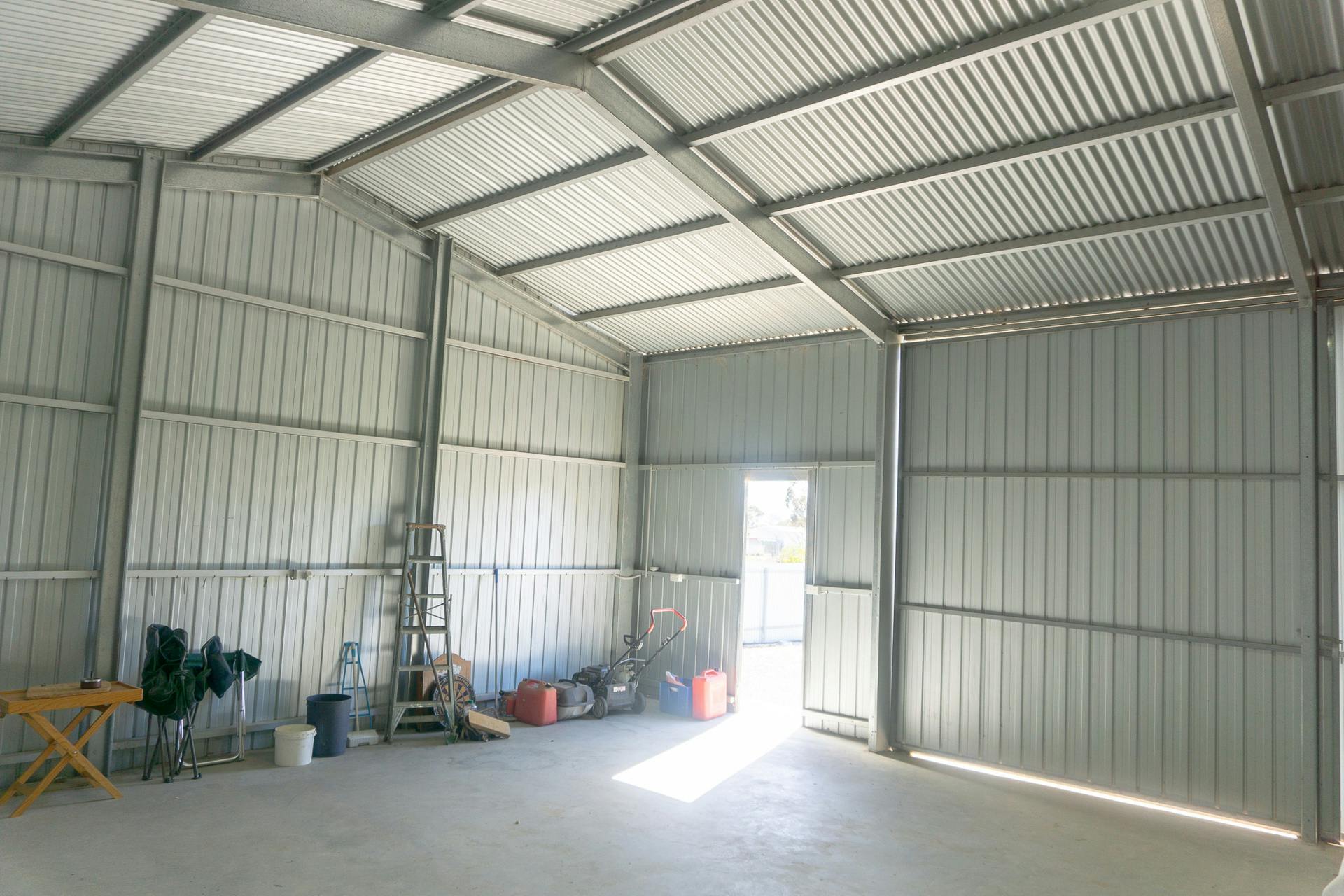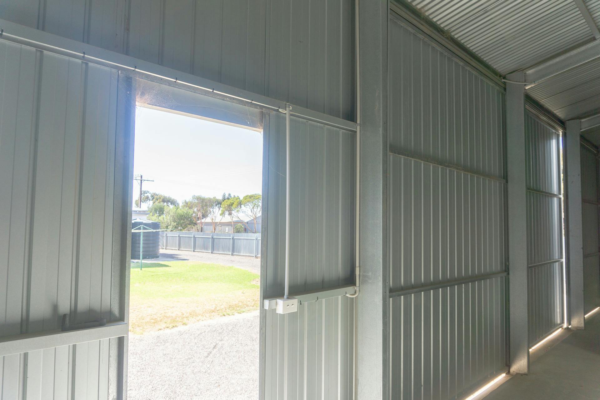 - Recently constructed 5-bay steel frame shed (approx. 15m x 7.5m x 4m) with 4 front sliding doors, concrete floor, power and light connections, and overhead storage area
